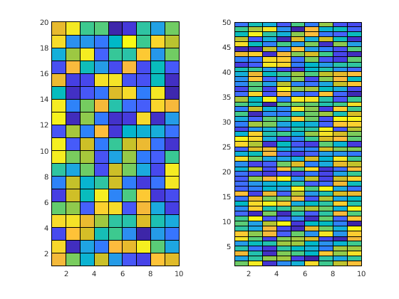 Начиная в R2019b, можно отобразить мозаичное размещение графиков с помощью tiledlayout и nexttile функции. Вызовите tiledlayout функция, чтобы создать 1 2 мозаичное размещение графика. Вызовите nexttile функция, чтобы создать объекты осей ax1 и ax2. Создайте два графика псевдоцвета путем определения осей в качестве первого аргумента к pcolor.