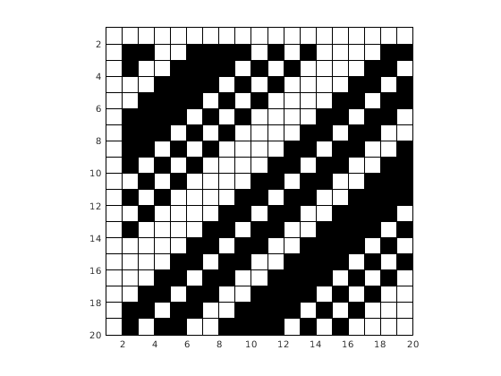 Создайте 20 20 матрица Адамара. Затем постройте матрицу с помощью черно-белой палитры. Используйте axis функционируйте, чтобы инвертировать направление оси Y и установить линии оси на равные длины.