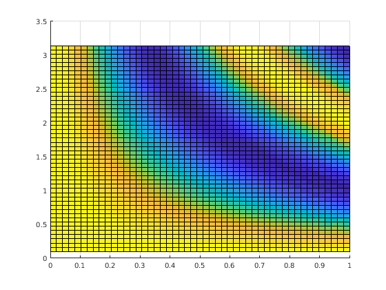 решает систему параболических и эллиптических УЧП с одной пространственной переменной x и время t. По крайней мере одно уравнение должно быть параболическим. Скалярный sol = pdepe(m,pdefun,icfun,bcfun,xmesh,tspan)m представляет симметрию проблемы (плита, цилиндрическая, или сферическая). Решаемые уравнения закодированы в pdefun, начальное значение закодировано в icfun, и граничные условия закодированы в bcfun. Обыкновенные дифференциальные уравнения (ОДУ), следующие из дискретизации на пробеле, интегрированы, чтобы получить приближенные решения во времена, заданные в tspan. pdepe функция возвращает значения решения на mesh, обеспеченной в xmesh.