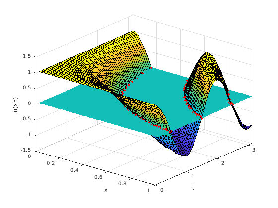 [ также находит, где функции (t, u (x, t)), вызвал функции события, является нулем. В выходе, sol,tsol,sole,te,ie] = pdepe(m,pdefun,icfun,bcfun,xmesh,tspan,options)te время события, sole решение во время события и ie индекс инициированного события. tsol вектор-столбец времен, заданных в tspan, до первого терминального события.