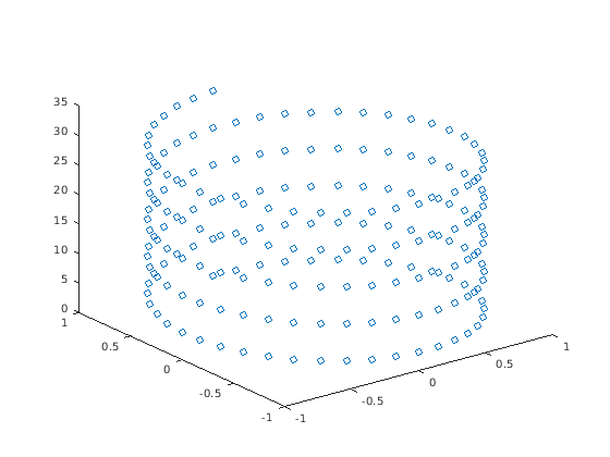 t = 0:pi/500:pi; xt(1,:) = sin(t).*cos(10*t); yt(1,:) = sin(t).*sin(10*t); zt = cos(t); plot3(xt,yt,zt,'-o','MarkerIndices',200)