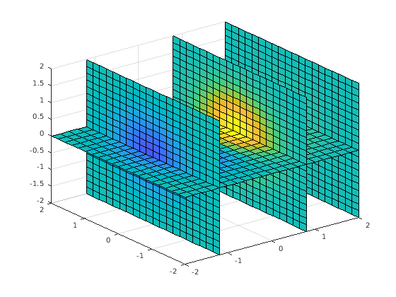 slice(чертит срезы для объемных данных X,Y,Z,V,xslice,yslice,zslice) V. Задайте XY, и Z как координатные данные. Задайте xslice, yslice, и zslice как местоположения среза с помощью одной из следующих форм: