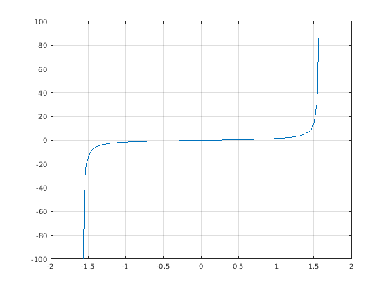 Для действительных значений X, tan(X) возвращает действительные значения в интервале [-∞, ∞].