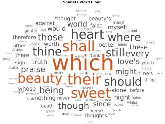 figure wordcloud(tbl,'Word','Count'); title("Sonnets Word Cloud")