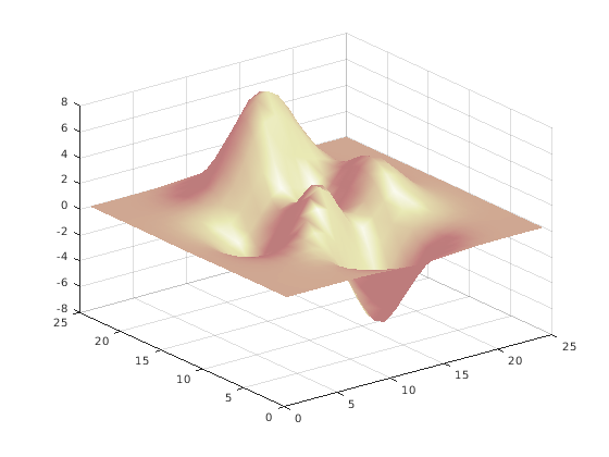 surfl(z) colormap(pink) % change color map shading interp % interpolate colors across lines and faces