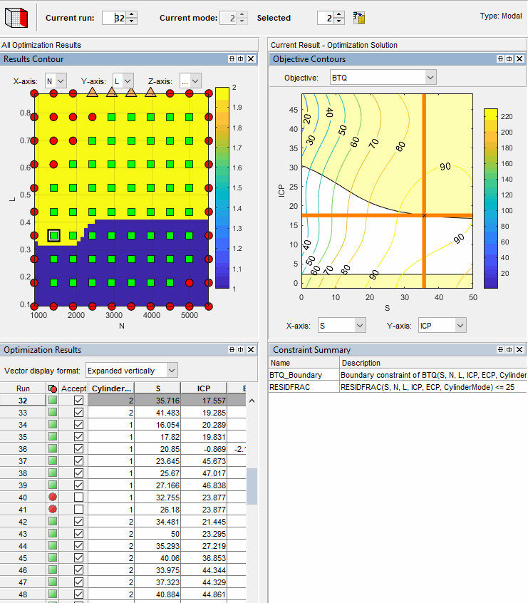 Представление по умолчанию в GasolineComposite.cag пример BTQ_Optimization_Output оптимизация показывает контурные графики для режима 1, 4 цилиндрических режима. Можно просмотреть Контур Результатов, Объективные Контуры, Результаты оптимизации и Ограничительные Сводные данные в размещении.