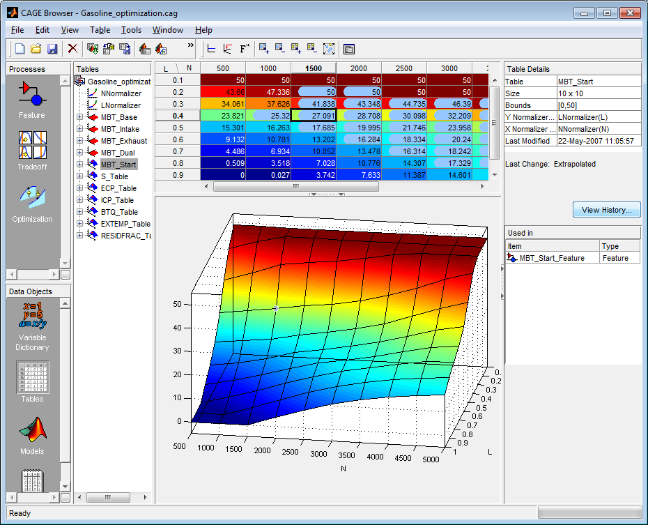 Под Табличными Деталями Используемый в панели отображает, какие элементы CAGE используют текущую таблицу (например, оптимизация, компромиссы, функции). Дважды кликните элементы в списке, чтобы изменить представление в те элементы.