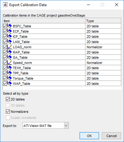 Если вы приняли решение экспортировать Selected Item, элементы списка зависят, на котором древовидном узле вы выбрали. Для табличной вершины список содержит таблицу и ее нормализаторы. Для узла Функции или Компромисса список включает целую функцию или компромисс (все таблицы, нормализаторы, кривые и константы). Для узла оптимизации список содержит любые таблицы, заполненные от результатов оптимизации.