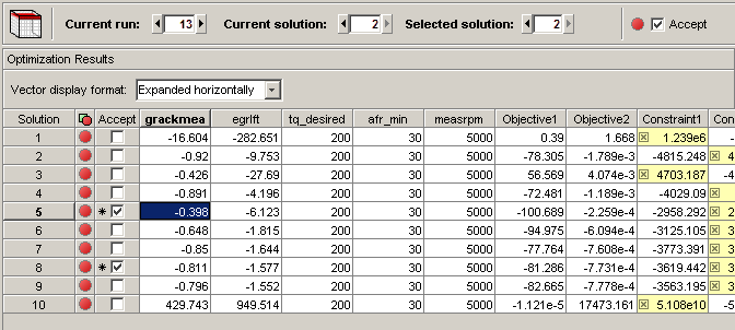 Как в других табличных представлениях, можно использовать флажки Accept, чтобы выбрать выбор строк в рамках таблицы. В этом табличном представлении можно только использовать это, чтобы выбрать решения в рамках одного запуска. Каждое различное решение имеет флажок и цветной значок для состояния “Acceptable”. Можно заменить эти выборы с помощью флажков, если вы хотите выбрать решения в рамках запуска, для использования при экспорте в набор данных, импорте к другой оптимизации, или для дальнейшего использования. Смотрите Приемлемые решения Выбора.
