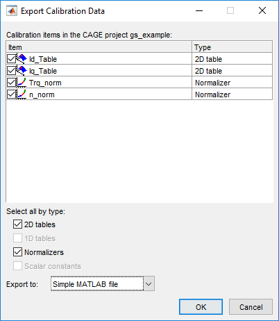 Использование Экспортирует Калибровочные Данные, чтобы выбрать элементы, чтобы экспортировать и отформатировать. Например, экспортируйте таблицы Id и Iq и точки останова к файлу MATLAB gs_example.m.