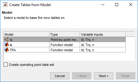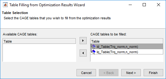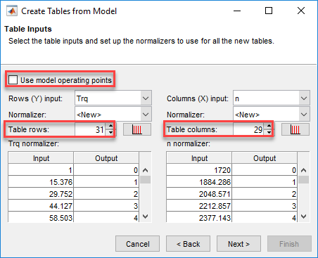 Составьте таблицы что использование оптимизатора Model-Based Calibration Toolbox, чтобы сохранить оптимизированные параметры. В данном примере таблицы: