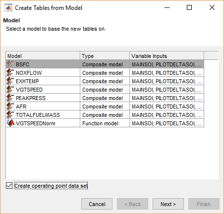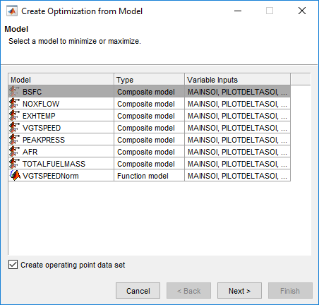 Выберите модель BSFC и флажок Create operating point data set, и нажимает Next.