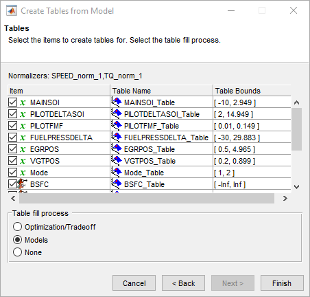 Чтобы видеть, как настроить таблицы, чтобы заполнить с результатами вашей оптимизации, выберите Tools> Create Tables from Model. Составлять Таблицы от мастера Модели появляются.