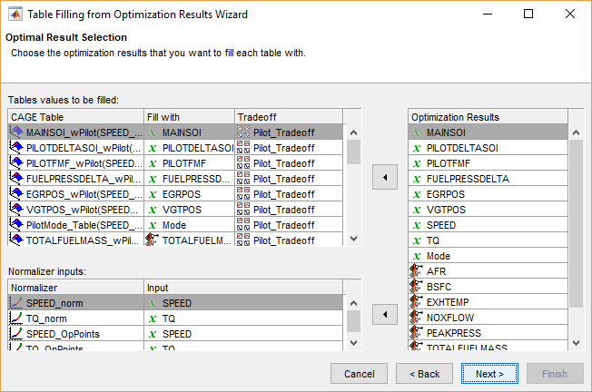 Заметьте, что настройки по умолчанию создадут оптимизацию точки, чтобы минимизировать BSFC в рабочих точках модели, с помощью шести свободных переменных и не SPEED, TQ, или Mode, и ограниченный граничным ограничением модели.
