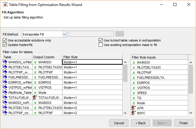 Заполните интерполяционные таблицы для всех входных параметров управления.