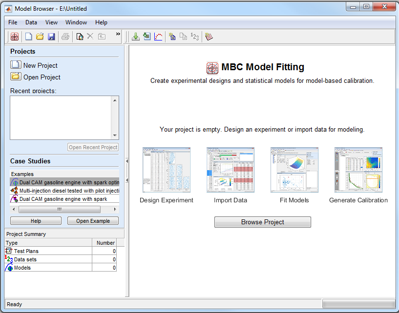 Когда вы открываете приложение MBC Model Fitting, домашняя страница помогает, вы начать или резюме работаете быстрее путем доступа к частым задачам, недавним проектам и показанным примерам.