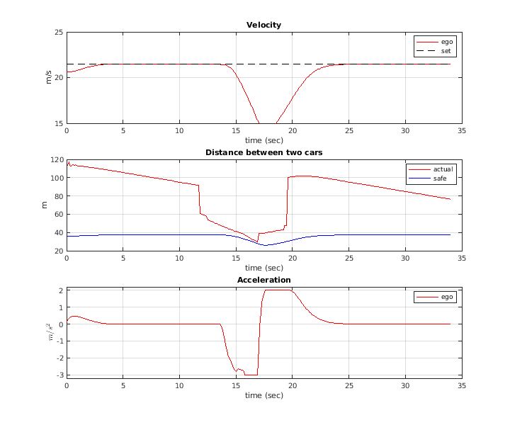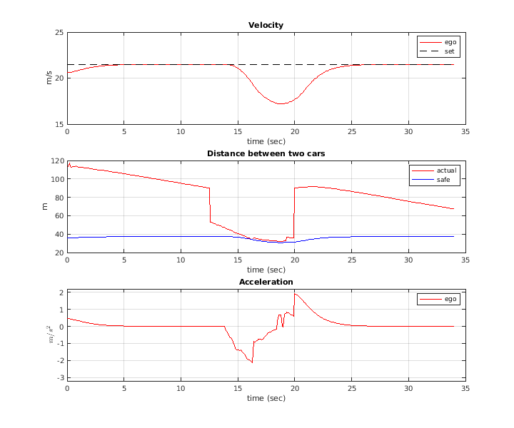 Другой автомобиль становится ведущим автомобилем с 11 до 20 секунд, когда автомобиль сокращает в маршрут автомобиля, оборудованного датчиком (средний график). Когда расстояние между ведущим автомобилем и автомобилем, оборудованным датчиком является большим (11-15 секунд), автомобиль, оборудованный датчиком все еще перемещается при скорости набора драйверов. Когда расстояние становится маленьким (15-20 секунд), автомобиль, оборудованный датчиком замедляется, чтобы обеспечить безопасное расстояние от ведущего автомобиля (главный график).