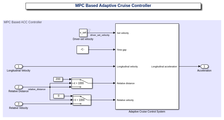 У адаптивного контроллера круиза есть два варианта: классический проект (значение по умолчанию) и основанный на MPC проект. Для обоих проектов применяются следующие принципы разработки. ACC оборудовал транспортное средство сплав датчика использования (автомобиля, оборудованного датчиком), чтобы оценить относительное расстояние и относительную скорость к ведущему автомобилю. ACC делает перемещение автомобиля, оборудованного датчиком при скорости набора драйверов при поддержании безопасного расстояния от ведущего автомобиля. Безопасное расстояние между ведущим автомобилем и автомобилем, оборудованным датчиком задано как