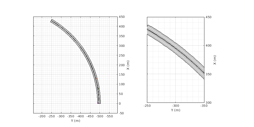 Приложение Driving Scenario Designer позволяет вам задавать дороги и транспортные средства, перемещающиеся на дорогах. В данном примере вы задаете две параллельных дороги постоянной кривизны. Чтобы задать дорогу, вы задаете дорожные центры, дорожную ширину и банковский угол (в случае необходимости). Дорожные центры были выбраны путем выборки точек вдоль круговой дуги, охвата поворота 60 градусов постоянного радиуса искривления.