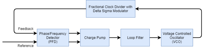 Эталонная архитектура Fractional N PLL with Delta Sigma Modulator использует блок Fractional Clock Divider with DSM в качестве делителя частоты в системе PLL. Делитель частоты делит частоту выходного сигнала VCO дробным значением с помощью метода модуляции сигмы дельты, чтобы сделать его сопоставимым с частотой сигнала ссылки PFD.