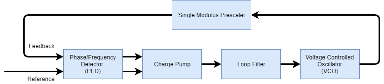 Эталонная архитектура Integer N PLL with Single Modulus Prescaler использует блок Single Modulus Prescaler в качестве делителя частоты в системе PLL. Делитель частоты делит частоту выходного сигнала VCO целочисленным значением, чтобы сделать его сопоставимым с частотой сигнала ссылки PFD.