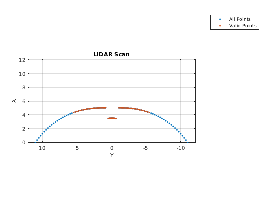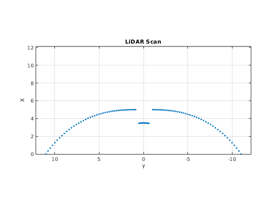 создает scan = lidarScan(ranges,angles)lidarScan объект от ranges и angles, это представляет данные, собранные от датчика лидара. ranges и angles входные параметры являются векторами той же длины и установлены непосредственно в Ranges и Angles свойства.