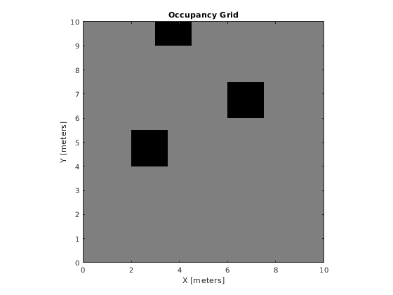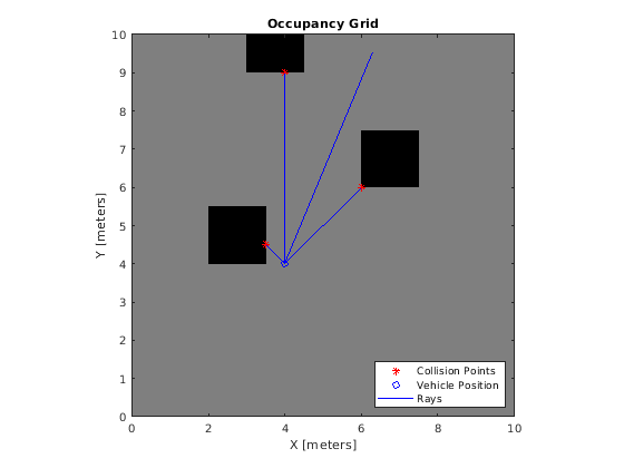 возвращает точки пересечения лучей и занятых ячеек в заданном intersectionPts = rayIntersection(map,pose,angles,maxrange)map. Лучи происходят от заданного pose и angles. Точки пересечения возвращены в системе координат мировой координаты. Если нет никакого пересечения до заданного maxrange, [NaN NaN] возвращен. По умолчанию, OccupiedThreshold свойство используется, чтобы определить занятые ячейки.