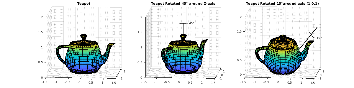 Все вращения в 3-D могут быть заданы осью вращения и углом вращения вокруг той оси. Рассмотрите 3-D изображение заварного чайника в крайнем левом графике. Заварной чайник вращается 45 градусами вокруг оси Z во втором графике. Более комплексное вращение 15 градусов вокруг оси [1 0 1] показывают в третьем графике. Кватернионы инкапсулируют ось и угол вращения и имеют алгебру для управления этими вращениями. quaternion класс и этот пример, используют соглашение "правила правой руки" задать вращения. Таким образом, положительные вращения по часовой стрелке вокруг оси вращения, когда просматривается от источника.