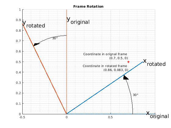 Вращение системы координат, в некотором смысле, противоположности вращения точки. Во вращении системы координат вращаются точки объектного зафиксированного пребывания, но система отсчета. Снова, рассмотрите вопрос (0.7, 0.5). Теперь система координат вращается 30 градусами вокруг оси Z. Обратите внимание на то, что, в то время как точка (0.7, 0.5) остается фиксированной, она имеет различные координаты в новой, вращаемой системе отсчета.
