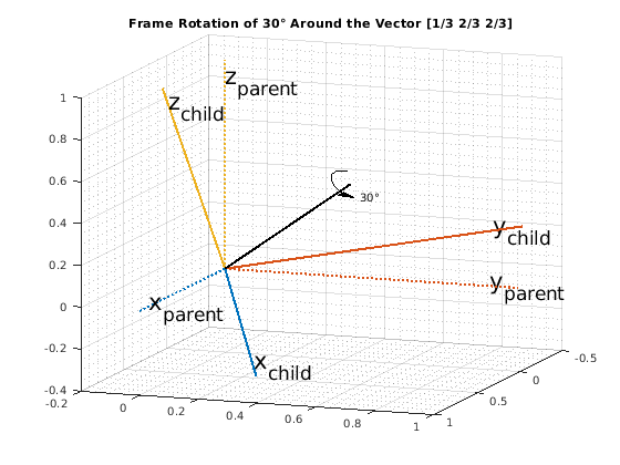 Рассмотрите пример, где дочерняя система координат вращается 30 градусов вокруг вектора [1/3 2/3 2/3].