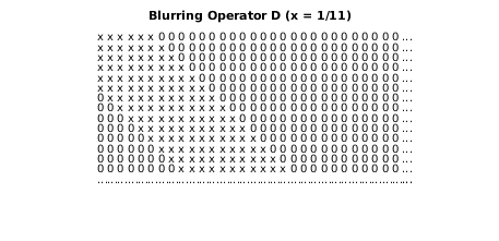 cla axis off ij xs = 31; ys = 15; xlim([0,xs+1]); ylim([0,ys+1]); [ix,iy] = meshgrid(1:(xs-1),1:(ys-1)); l = abs(ix-iy)<=5; text(ix(l),iy(l),'x') text(ix(~l),iy(~l),'0') text(xs*ones(ys,1),1:ys,'...'); text(1:xs,ys*ones(xs,1),'...'); title('Blurring Operator D (x = 1/11)')