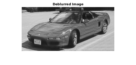 Изображение deblurred намного более ясно, чем размытое изображение. Можно еще раз считать номерной знак. Однако изображение deblurred имеет некоторые артефакты, такие как горизонтальные полосы в нижней правой области тротуара. Возможно, эти артефакты могут быть удалены регуляризацией.
