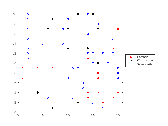 h = figure; plot(xloc(1:F),yloc(1:F),'rs',xloc(F+1:F+W),yloc(F+1:F+W),'k*',... xloc(F+W+1:F+W+S),yloc(F+W+1:F+W+S),'bo'); lgnd = legend('Factory','Warehouse','Sales outlet','Location','EastOutside'); lgnd.AutoUpdate = 'off'; xlim([0 N+1]);ylim([0 N+1])