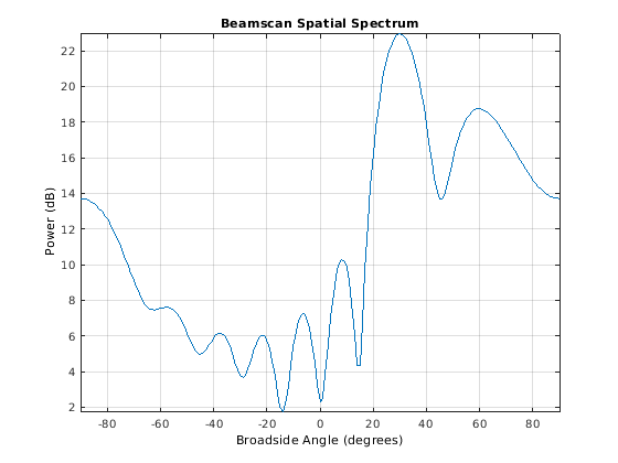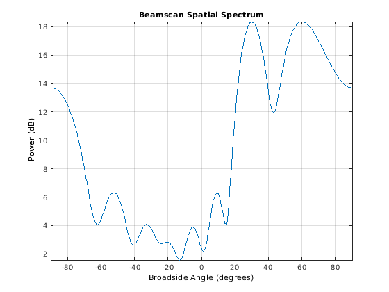 estimator = phased.BeamscanEstimator('SensorArray',array,... 'PropagationSpeed',c,'OperatingFrequency',fc,... 'DOAOutputPort',true,'NumSignals',2); [~,ang_est] = estimator(x);