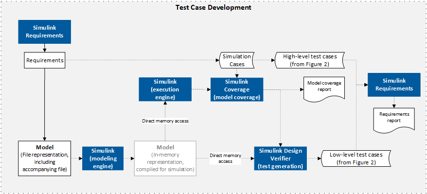 Низкоуровневые тесты и ожидаемые результаты основаны на моделях, которые представляют низкоуровневые требования. Simulink Design Verifier™ может использоваться, чтобы разработать эти тесты (см. рисунок 3). Simulink Design Verifier использует модель в качестве своего первичного входного параметра и также имеет возможность ввести данные о покрытии. DO - 178C вызывает это, если можно показать, что высокоуровневые тесты покрывают низкоуровневые требования, затем те низкоуровневые требования не должны быть покрыты определенными низкоуровневыми тестами. Покрытие модели может использоваться в качестве доказательства, что высокоуровневые тесты покрывают низкоуровневые требования, в частности для логических решений в моделях, но также и для данных об интерполяционной таблице и данных о диапазоне сигнала в моделях. Simulink Design Verifier может затем использоваться, чтобы сгенерировать тесты для остающихся низкоуровневых требований, которые не покрыты высокоуровневым тестированием, например, выведенные требования в модели. Пользователь может также вставить ограничения сигнала и определяемые пользователем цели тестирования в моделях или в тестовых обвязках модели, чтобы завершить тестирование. Использование целей тестирования на входных параметрах к модели, чтобы вставить тестовые данные вне нормальных областей значений является хорошим способом проверить робастность, например.