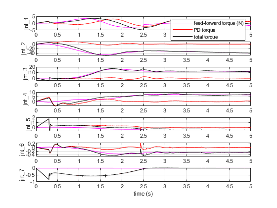 tauFeedForward(i,:) = inverseDynamics(lbr, qDesired(i,:), qdotDesired(i,:), qddotDesired(i,:));