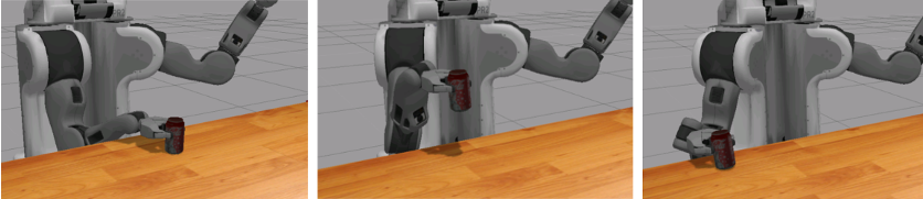 initialGuess = jntPos; % current jnt pos as initial guessЗадайте положения исполнительного элемента конца, связанные с задачей. В этом примере PR2 достигнет к банке на таблице, схватит банку, переместит его в другое место и запишет его снова. Мы будем использовать inverseKinematics возразите, чтобы запланировать движения, что гладко переход от одного исполнительного элемента конца позирует другому.