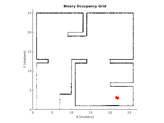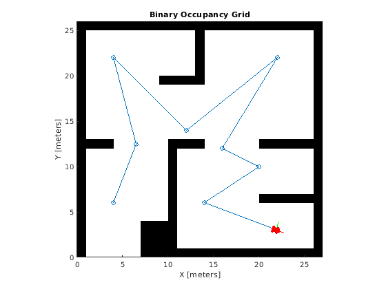 В этом примере показано, как создать карту среды с помощью показаний датчика области значений, и робот позирует роботу с дифференциальным приводом. Вы создаете, создают карту из показаний датчика области значений, которые симулированы с помощью rangeSensor объект. differentialDriveKinematics модель движения симулирует управление роботом вокруг комнаты на основе скоростных команд. rangeSensor дает показания области значений на основе положения робота, когда это следует за путем.