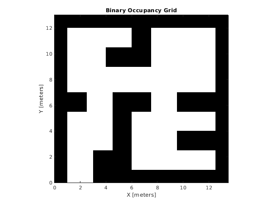 Используйте импортированный simpleMap данные и построение представление сетки заполнения с помощью binaryOccupancyMap объект. Установите разрешение 2 ячеек на метр для этой карты.