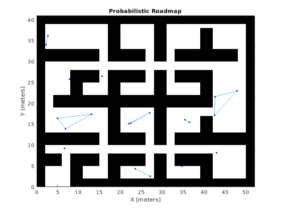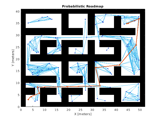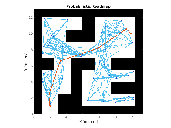 Этот пример демонстрирует, как вычислить препятствие свободный путь между двумя местами на данной карте с помощью Вероятностной Дорожной карты (PRM) планировщик пути. Планировщик пути PRM создает дорожную карту в свободном пространстве данной карты, использующей случайным образом произведенные узлы в свободном пространстве и соединяющей их друг с другом. Если дорожная карта была создана, можно запросить для пути от данного местоположения запуска до данного местоположения конца на карте.