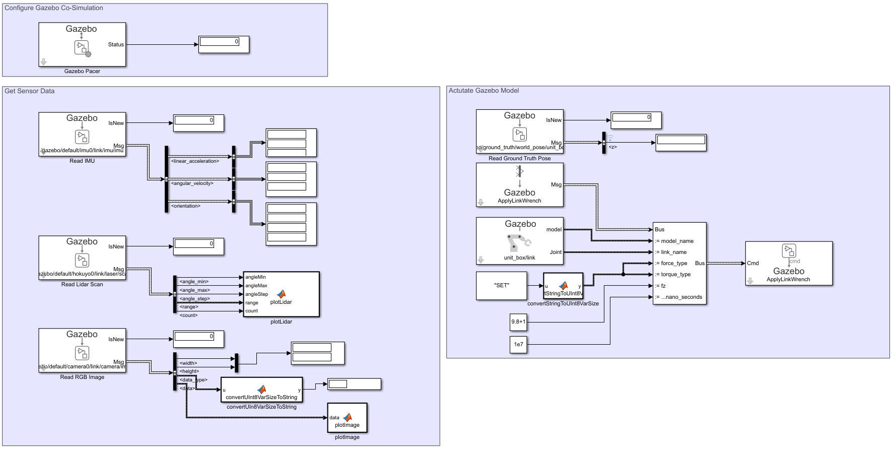 Откройте performCoSimulationWithGazebo модель, которая демонстрирует, как получить данные о датчике из этих симулированных датчиков и как привести в движение модульную модель поля от Simulink.