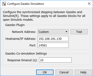 open_system('performCoSimulationWithGazebo/Gazebo Pacer') В Сетевом выпадающем Адресе выберите Custom. Введите IP-адрес своей машины Linux. Портом по умолчанию для Gazebo является 14581. Установите тайм-аут Ответа на 10 секунд.