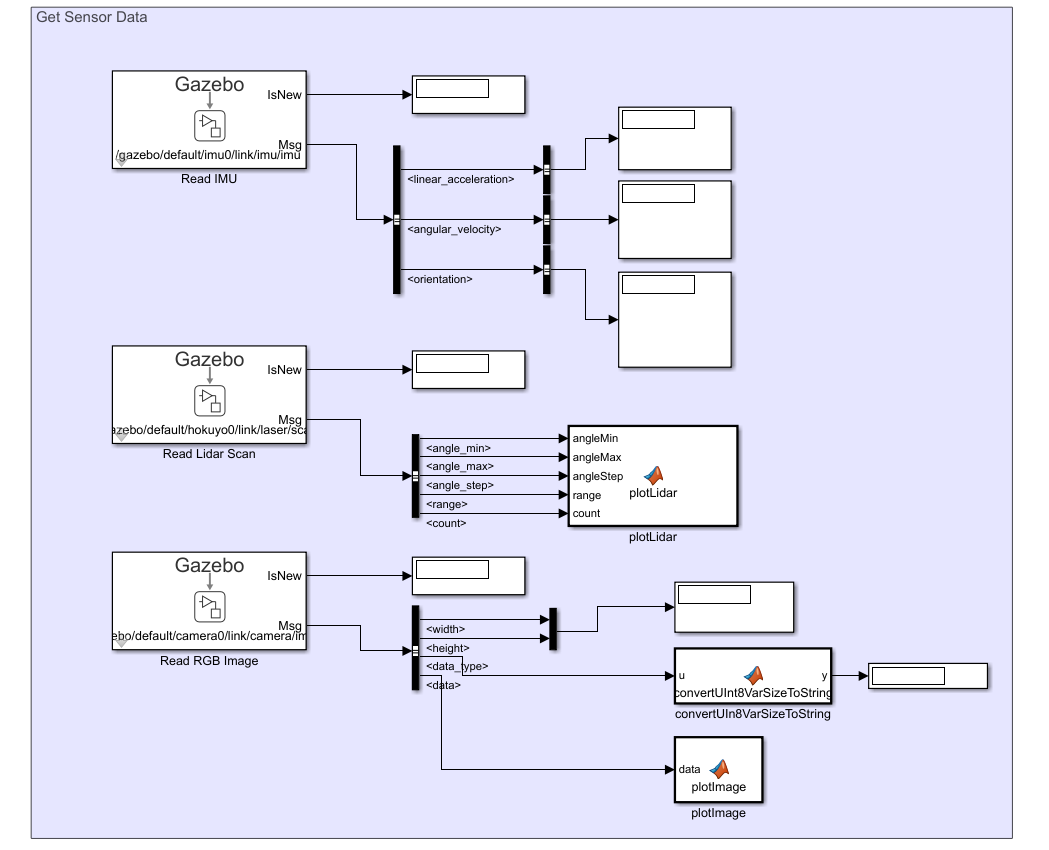 Используйте блок Gazebo Read, чтобы получить данные по определенным темам от трех датчиков: