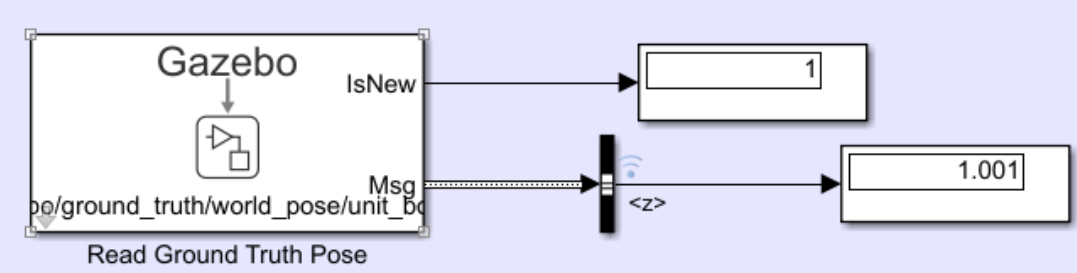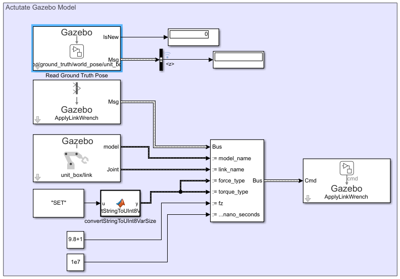 Используйте блок Gazebo Apply Command, чтобы прикладывать постоянную силу в z-направлении к модульному полю, которое приводит к ускорению 1 . Создайте пустой ApplyLinkWrench сообщение с помощью сообщения Пробела Gazebo. Укажите элементы сообщения, чтобы прикладывать силу к unit_box/link сущность с помощью блока Bus Assignment. Используйте Чтение Gazebo, чтобы вывести положение основной истины поля. Смещение поля за 1 второй период должно быть близко к 0,5 метрам.