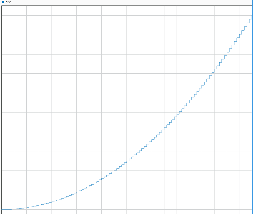 График временной зависимости положения модульного блока поля в z-направлении может быть просмотрен с помощью Data Inspector. Блок отслеживает параболическую форму из-за постоянного ускорения в зависимости от времени.