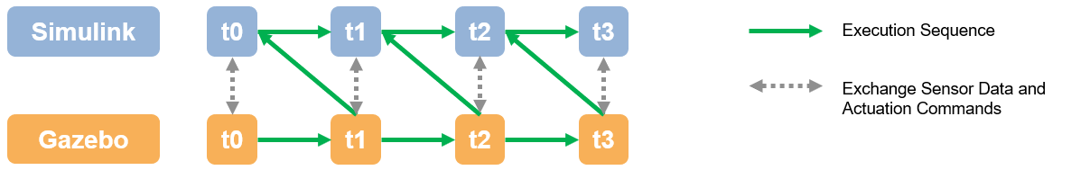 Данными о датчике и командами приведения в действие обмениваются на правильном временном шаге. Выполнение принимает решение продвинуться Gazebo сначала, затем Simulink. Выполнение симуляции находится все еще на t+1, Simulink только остается на предыдущем разе шага, пока вы не возобновляете модель.