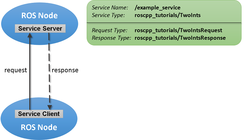 ROS поддерживает два основных коммуникационных механизма: темы и сервисы. Темы имеют издателей и подписчиков и используются в отправке и получении сообщений (см., обмениваются Данными с Издателями ROS и Подписчиками). Сервисы, с другой стороны, реализуют более трудную связь путем разрешения коммуникации ответа запроса. Сервисный клиент отправляет сообщение запроса в сервисный сервер и ожидает ответа. Сервер будет использовать данные в просьбе создать сообщение ответа и передает его обратно клиенту. Каждый сервис имеет тип, который определяет структуру сообщений запроса и ответа. Сервисы также имеют имя, которое уникально в сети ROS.