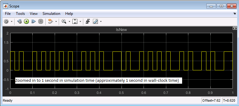 В отображении Осциллографа заметьте, что IsNew выход имеет значение 1 на аппроксимированном уровне 20 раз в секунду в прошедшее тактовое стеной время.