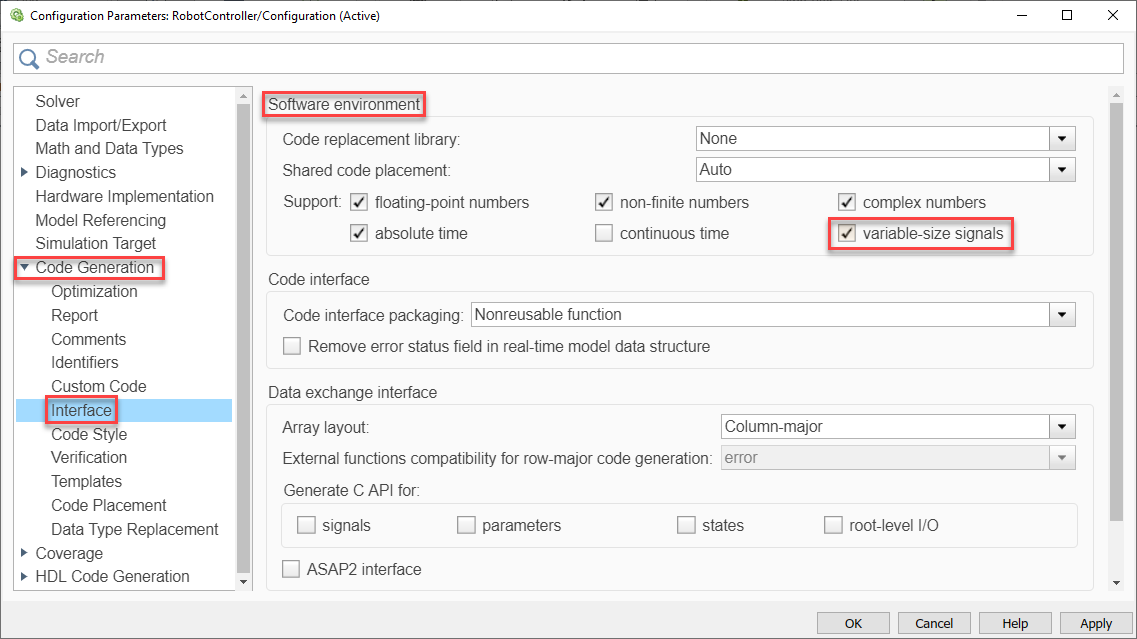 Модель требует массивов переменного размера. Чтобы включить эту опцию, проверяйте сигналы переменного размера под Генерацией кода> Интерфейс> Программная среда. Если это не доступно, установите Системный конечный файл под Генерацией кода к ert.tlc.