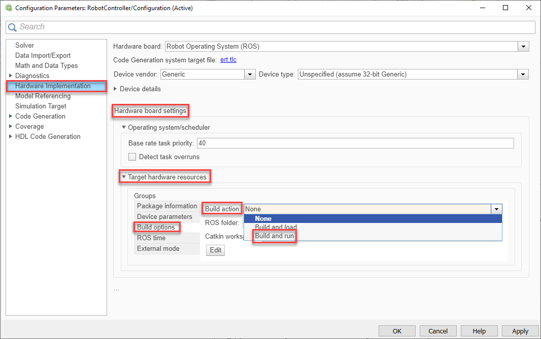 В панели Аппаратной реализации диалогового окна Параметров конфигурации выберите действие Build при Аппаратных настройках платы> ресурсы Целевого компьютера> Группы> Опции Сборки. Выбранное действие сборки влияет на поведение Simulink при создавании модели. Ни один (настройка по умолчанию) только не генерирует код для узла ROS, не создавая его на внешнем устройстве ROS. Создайте и загрузка генерирует код, передает его внешнему устройству и создает исполняемый файл узла ROS. Если вы выбираете Build и запуск, получившийся исполняемый файл узла запускается автоматически в конце сборки.